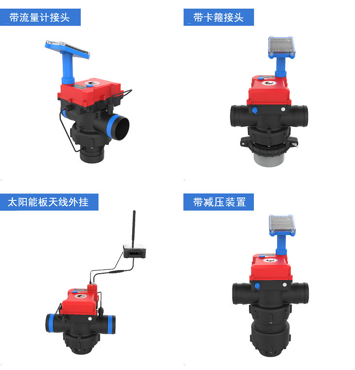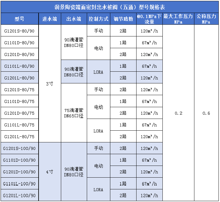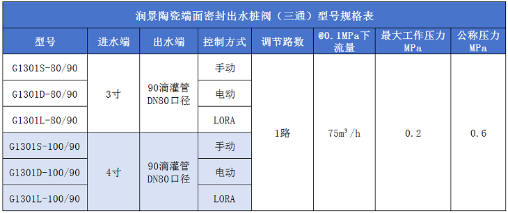 目前,潤(rùn)景出水樁閥有三通、五通、單路出水、雙路出水和手動(dòng)、4G、LORA自動(dòng)控制等多種規(guī)格型號(hào),進(jìn)水端可選3寸或4寸,還可選帶流量計(jì)接頭、帶卡箍接頭、帶減壓裝置、太陽能板天線外掛等功能,滿足不同灌溉場(chǎng)景使用需求。