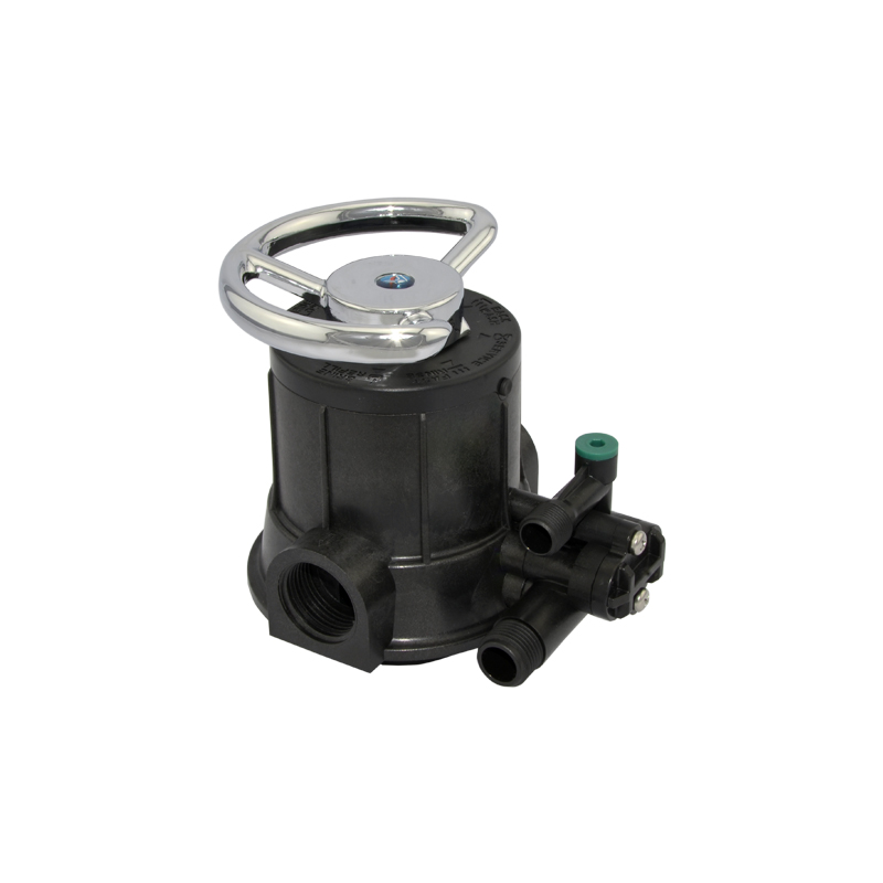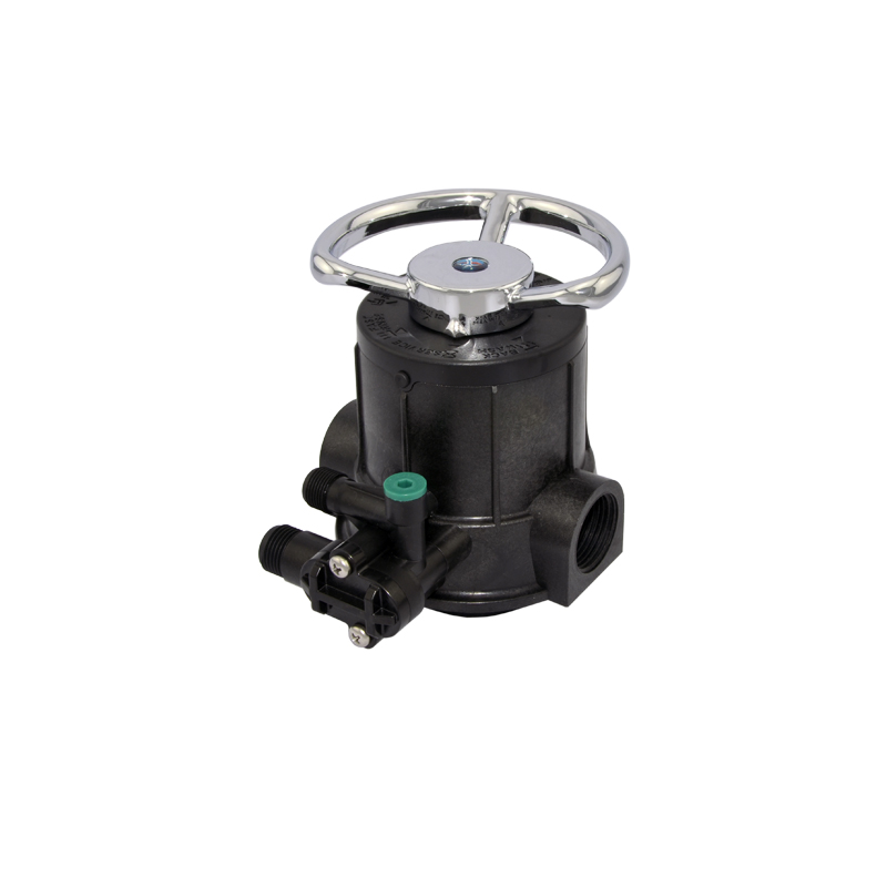 The F64A manual multiport softener control valve operates with a flow rate of 4m3/h. It carries out the functions of service, backwash, brine and slow rinse, brine refill, and fast rinse. The functions can be switched by rotating the handwheel.